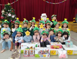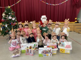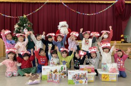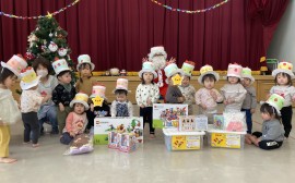12月24日は、子ども達が楽しみにしていたクリスマス会が行われました。年少、年中、年長さんは、クリスマスの曲「ジングルベル」「サンタがまちにやってくる」に合わせて踊ったり、みんなで「サンタクロース」を歌いました。